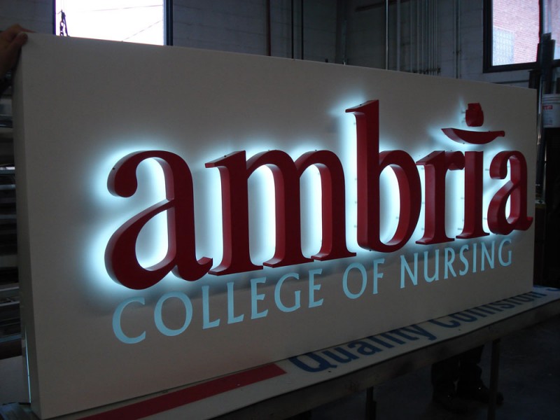 Reverse channel letters are characterized to have metal faces and sides. Neon or LEDs are placed inside the letter cavity to shine out the back of the letter. The letter is spaced off the wall slightly so that a halo is formed around the letter once illuminated. Because light shines out the back of the letters, they cannot typically be installed on raceways or wireways, unless back plates are employed to bounce the light.