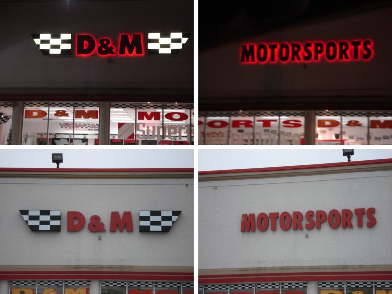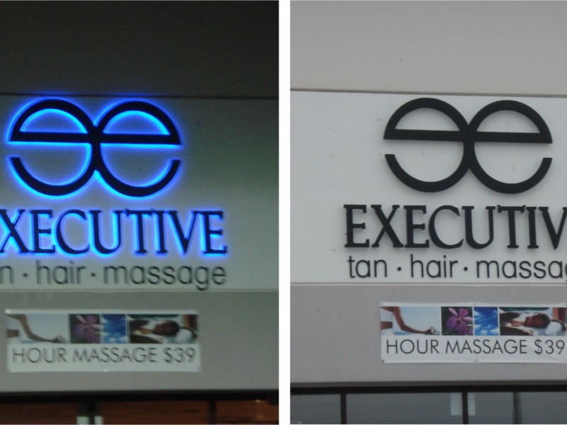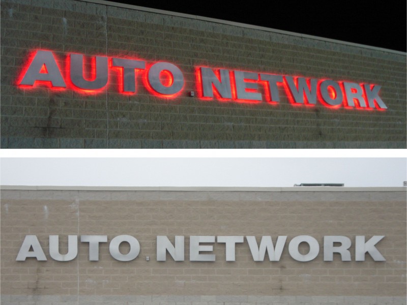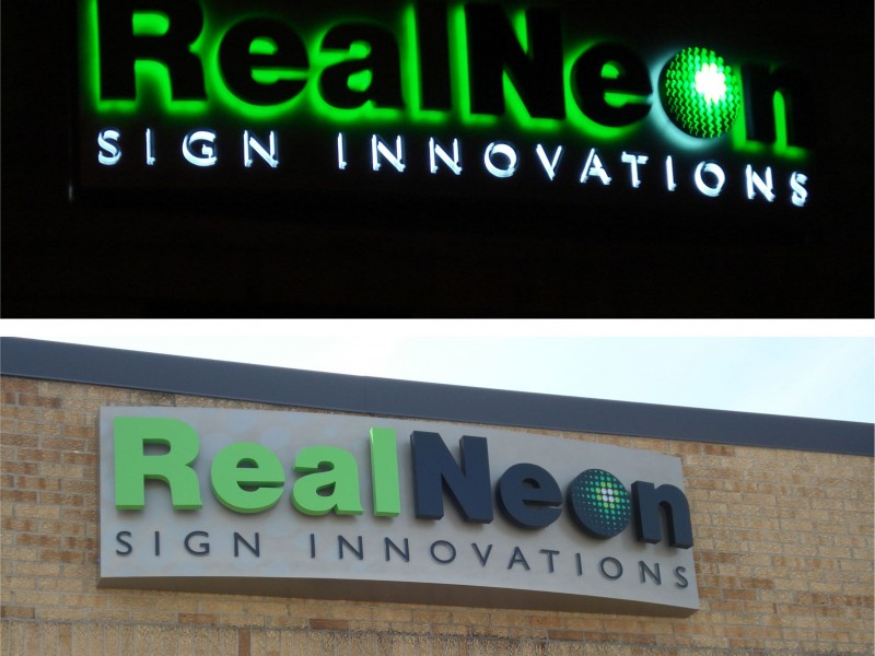 Reverse channel letters are characterized to have metal faces and sides. Neon or LEDs are placed inside the letter cavity to shine out the back of the letter. The letter is spaced off the wall slightly so that a halo is formed around the letter once illuminated. Because light shines out the back of the letters, they cannot typically be installed on raceways or wireways, unless back plates are employed to bounce the light.